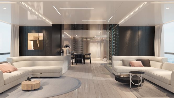 Divided into a separate seating area with panoramic views and a dining area, the main deck salon is ideal for socialising, lounging and dining. One of the key features of the main deck layout is the custom 150-bottle wine cellar located between the living area and the owner’s suite.