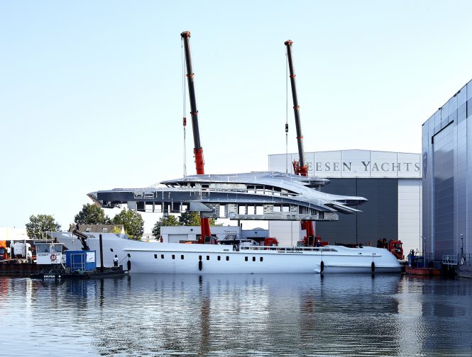 Weighing below 500GT, once delivered will have a range of 3,800 nautical miles at a cruising range of 12 knots, while fitted with two MTU 8V4000 M63 Diesel engines of 1000KW each. She is expected to reach a maximum speed of 15 knots. A true bluewater vessel, she offers smooth and comfortable cruising thanks to her full displacement bilge hull and bulbous bow. The superyacht is undergoing an outfitting phase at the moment and is expected to be delivered on 28th February 2020.