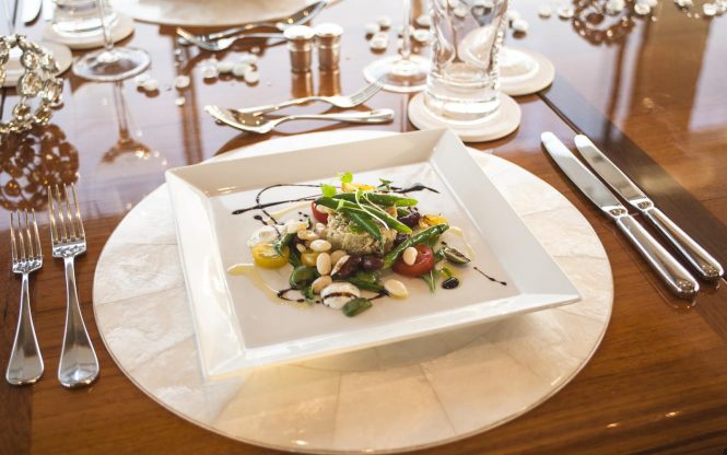 Evenings are the highlight of a yacht charter day. After having a shower and putting on a new outfit, meet fellow guests in the saloon bar for drinks. A formal five-course meal is often served, good enough for a Michelin restaurant.