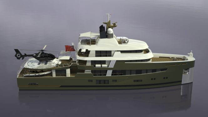 There are three proposed designs of the aft deck depending on an owner’s preferences. The Cruiser Mood provides a massive are for carrying water toys or a sailing yacht of up to 30ft. The Voyager Mood offers an additional platform connected to the aft bridge deck to serve as a recreation and relaxation area. The Explorer Mood has an additional platform that can be enlarged to serve as a helipad. Space underneath will allow carrying 20 ft containers to store water toys.