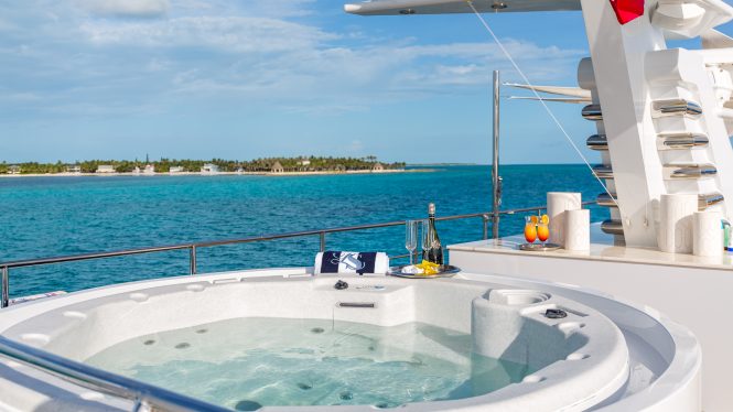 The abundance of outdoor space is perfect for savouring the sunshine and the panoramic views: The main deck aft has a grand alfresco dining table beneath a bimini shade. The sundeck is ready to host a social occasion in the sunshine or under the stars, with a sundeck Jacuzzi, sunbeds, a large bar and plenty of seating under the canvas.