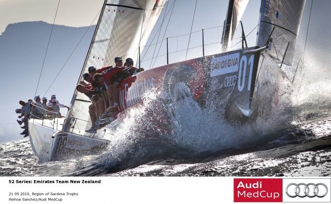 Their Region of Sardinia Trophy Regatta lead after Day 1 on the Gulf of Cagliari may be the smallest possible, but Emirates Team New Zealand (NZL) proved why they are so firmly on course for their second successive Audi MedCup Circuit today when they stretched their overall Circuit lead still further over 2008 champions Quantum Racing (USA)