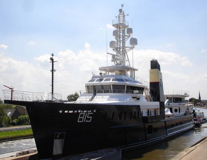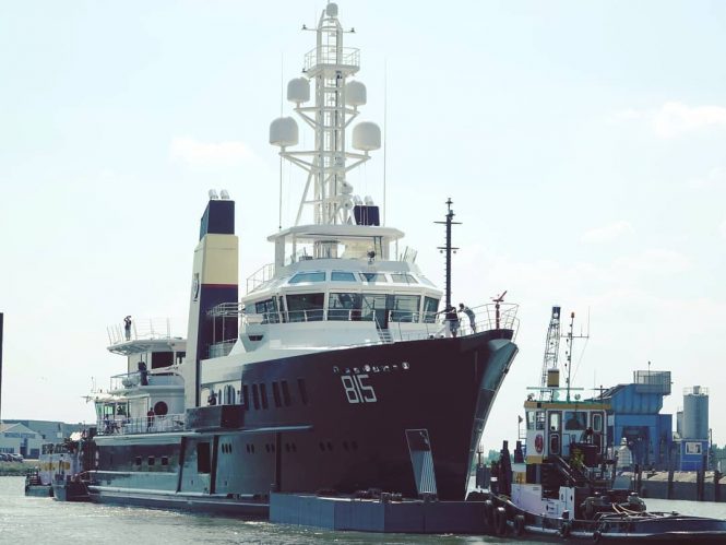 Luxury Feadship superyacht Sherpa was spotted while on the move to Rotterdam for the final outfitting. As soon as she is fully completed, Sherpa will undergo sea trials this summer before making her appearance in the Med events in September.