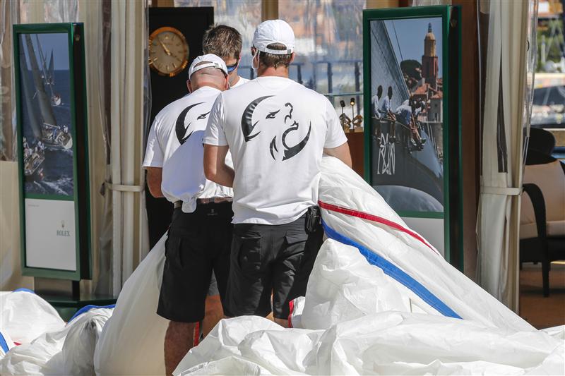 Crew members of Lupa of London yacht during sail measurement on Piazza Azzurra