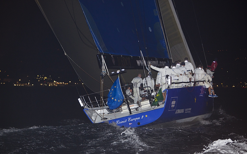 Sailing yacht ESIMIT EUROPA 2 at the finish line in Genoa, line honours winner Photo credit Rolex Carlo Borlenghi