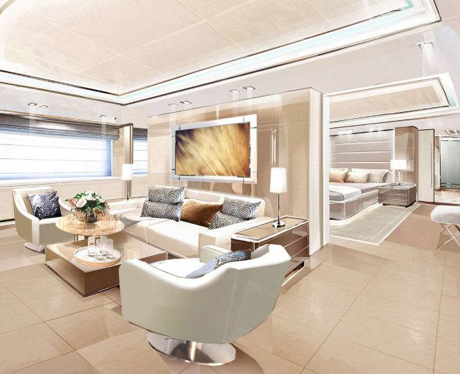 There are seven staterooms to accommodate up to 14 guests, including the Owner’s suite located on the upper deck aft, which covers 70m²/230ft². On the main deck there is a VIP stateroom and a twin cabin, and on the lower deck there three double cabins and another twin cabin.