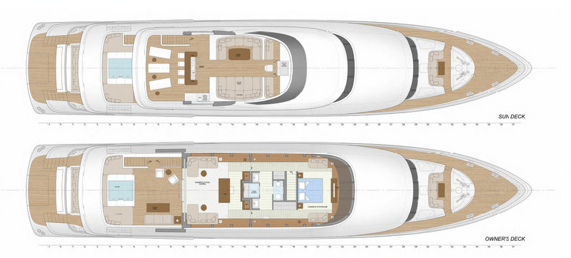 The 42m Jongert luxury yacht layout of sun deck and owner´s deck
