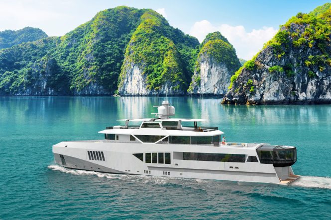 The design uses a wide beam of 9m/30ft and an interior volume of 690 GT. The main deck forward contains a full-beam Master suite with two fold-down terraces, and the space can be converted into two VIP staterooms. Four en-suite cabins are located on the lower deck that can be converted from twins into doubles.