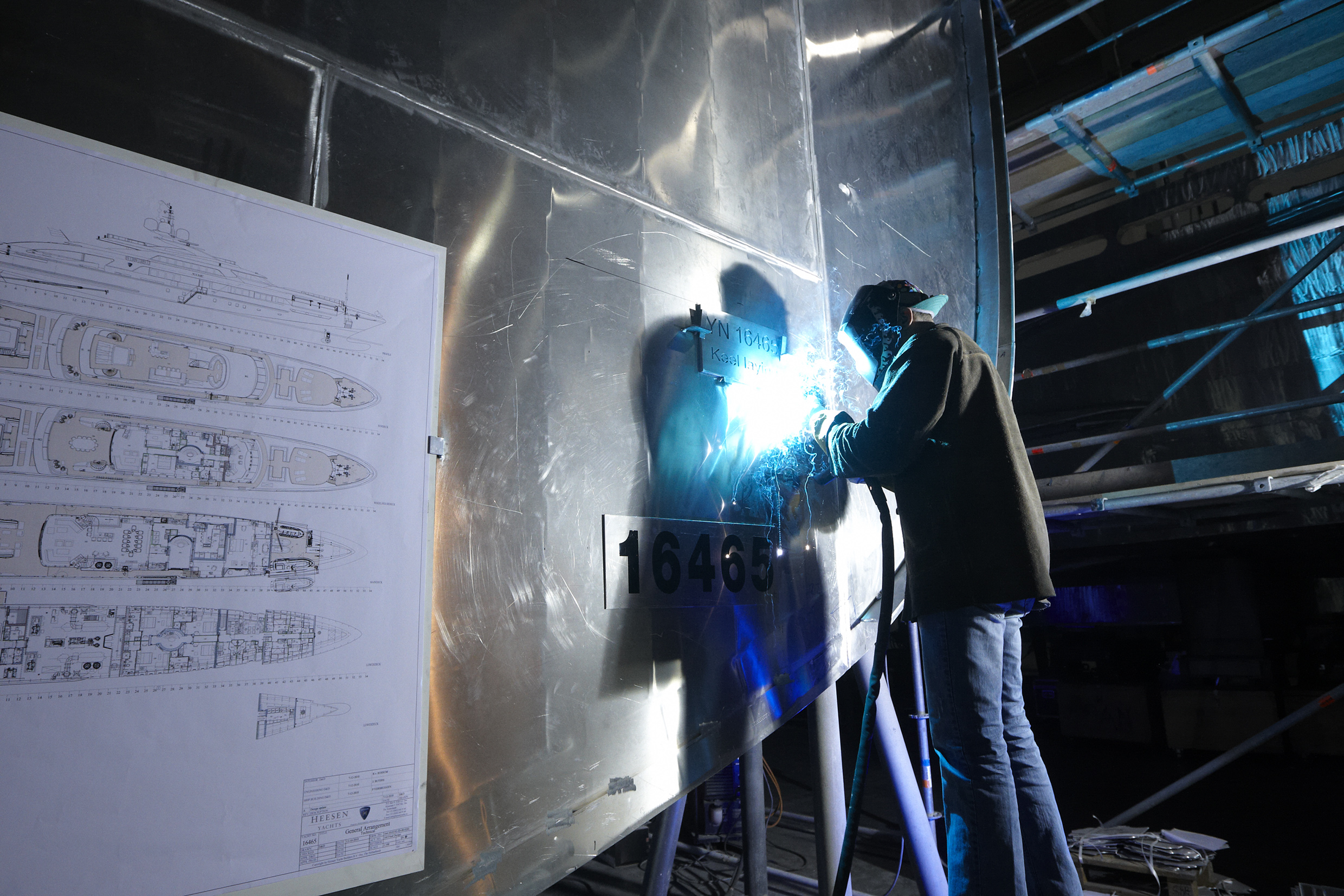 Ceremonial welding of a memorial plate to the structure of Heesens’ HY16465 65m Fast Displacement Hull Form (FDHF) Superyacht – Photo Credit Dick Holthuis