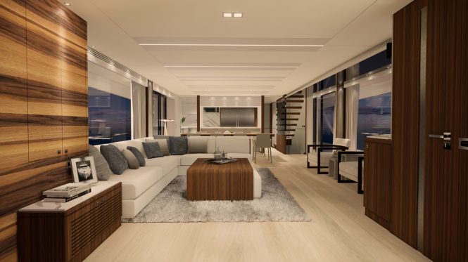 The interior design includes walnut woodwork in a satin finish, which together with plenty of natural light in the indoor areas, creates a welcoming atmosphere onboard.