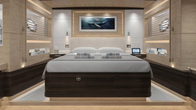 The interior has been designed by Stephen Huish Yacht Design. Although the exterior profile will resemble a luxury gulet, the indoor living spaces will feature a modern and minimalistic design with bleach oak, American walnut and stainless steel.