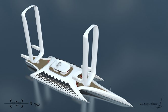 French superyacht designer Mathis Ruhl has unveiled a sailing trimaran concept, named the Wind Motion 70T. A project about ‘efficiency and self-sufficiency’, the 70m/230ft luxury trimaran uses wind as the main source of propulsion in medium conditions and has a noteworthy rig system designed for efficient performance with the traditional grace associated with sailing yachts.