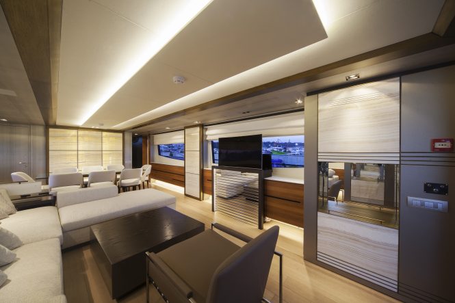 Within the main salon, floor-to-ceiling panels the forward wall uses back-lit marble for a warm and ambient glow for formal dining between eight guests. Additional floor-to-ceiling panels are placed between the dining table and the generous corner sofa where the group can sink down for conversation or a film on the opposite widescreen TV.