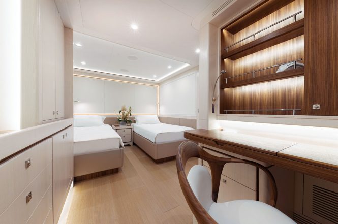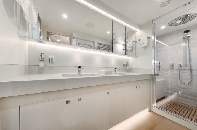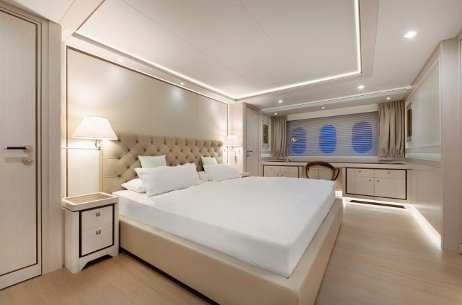 The accommodation is designed for up to six guests to keep an intimate atmosphere on board, and the cabins consist of a Master suite and two twin cabins, each with en-suite facilities.