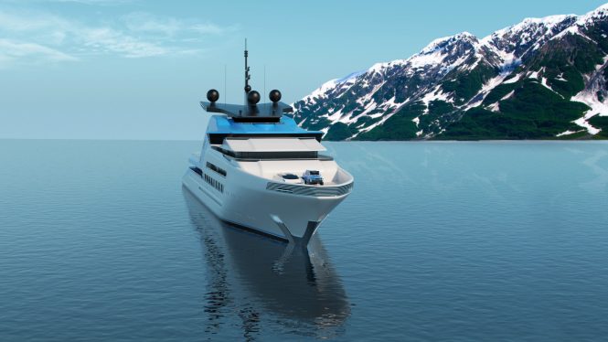 Inspiration was drawn from the raw power of nature and the rough weather conditions of Northern Norway, where Kurt Strand spent his childhood. M/Y AURORA BOREALIS is able to transform with retractable balconies and large gates for an even greater connection with the natural surroundings. The exterior concept images show a white steel hull and sky blue aluminium superstructure that integrates full-height windows, balconies and transom doors in the hull.