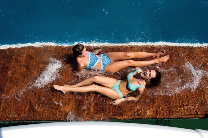 Luxury catamaran WHISPERS II will be a popular choice for families with young children, who like to bounce on the forward trampolines or use the nets to sunbath while watching the water below.