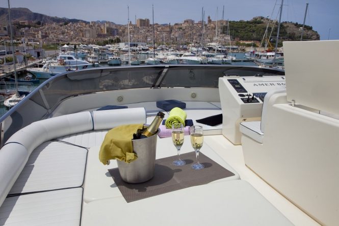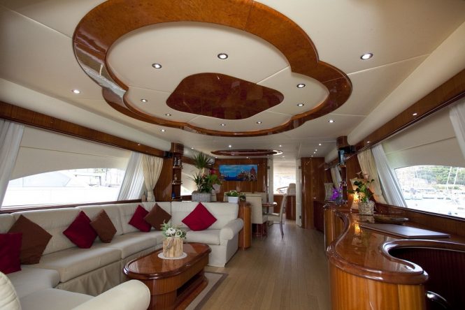 As well as alfresco dining in the shade of the main deck aft, guests can take a meal in the sunshine on the flybridge, and sunpads are located on this deck as well as on the bow.