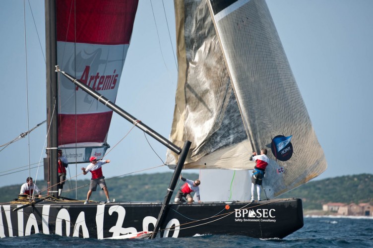 Louis Vuitton Trophy, Race Day 8. Artemis genaker pole goes overboard during the takedown, breaks and drags the genaker under the boat. Photo Credit Paul Todd