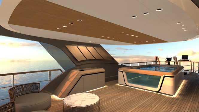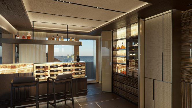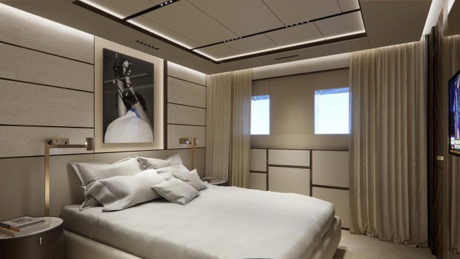 The exteriors feature plenty of sunbathing and alfresco dining areas, chief among them the versatile circular foredeck sunbathing and lounging space that is also a certified helipad. The sundeck has an outdoor gym to the stern and the forward Jacuzzi is the perfect place to rest post-workout and take in the scenic views of Sardinia or the Port-Cros National Park among the peaceful Hyères Islands. The lower deck beach club will serve as a formal dining area right beside the water, and elsewhere on board there is an alfresco cinema for family films under the stars.