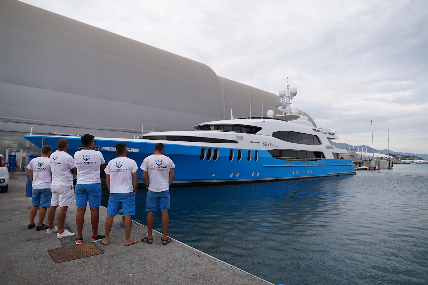 This image is featured as part of the article Luxury charter yacht Skyfall receives new LuxWrap sky blue hull.