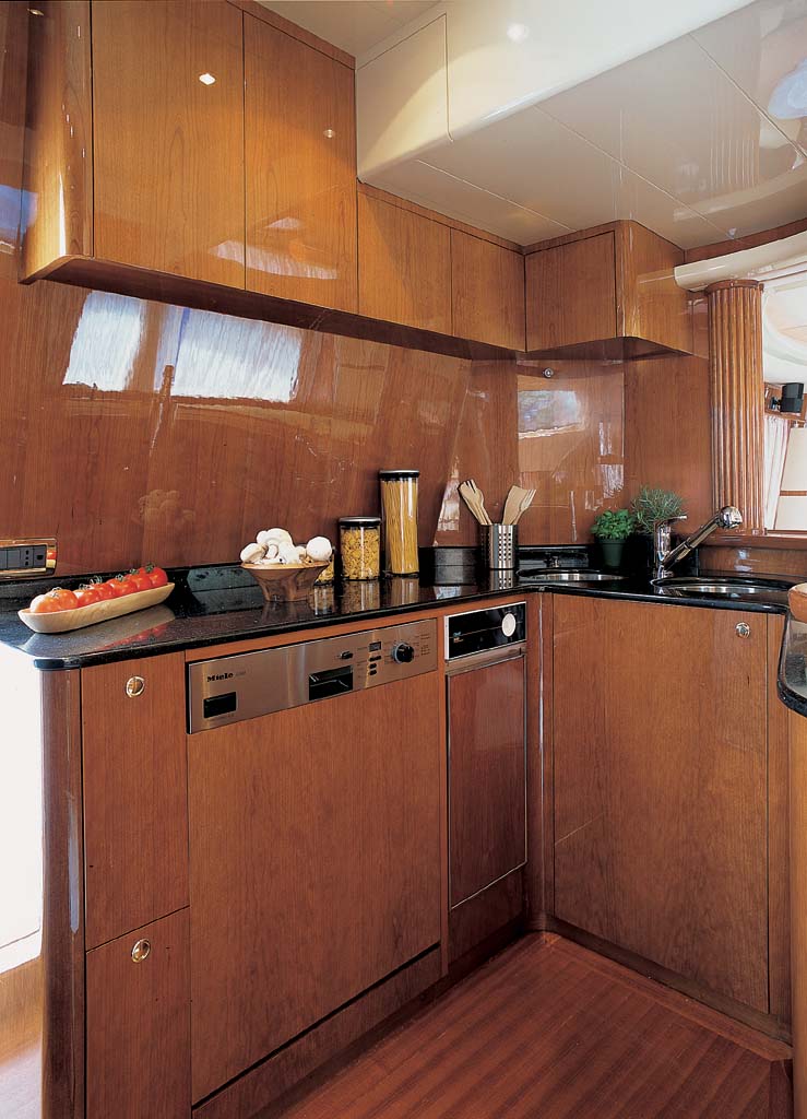 The style of the Azimut 72 Fly yacht’s interiors come either in bleached oak and glossy Ebony essence, or in natural heat‐treated oak essence and precious glossy Sycamore. Careful planning of the lighting design has enabled all fixtures to be completely encased in the ceilings as well as furnishings.