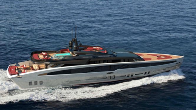 Behind the silvery grey or charcoal grey choice of hull colours, the tender garage forward of the beach club is designed to fit a 6.5m/21ft tender to be launched and retrieved via a side hatch. The lower deck will also contain four large guest cabins and a generous crew area for eight. The main deck forward shall host the Master suite built with a fold-down terrace and panoramic views, while the salon and formal dining area would be placed aft.