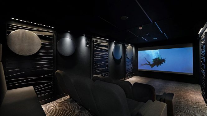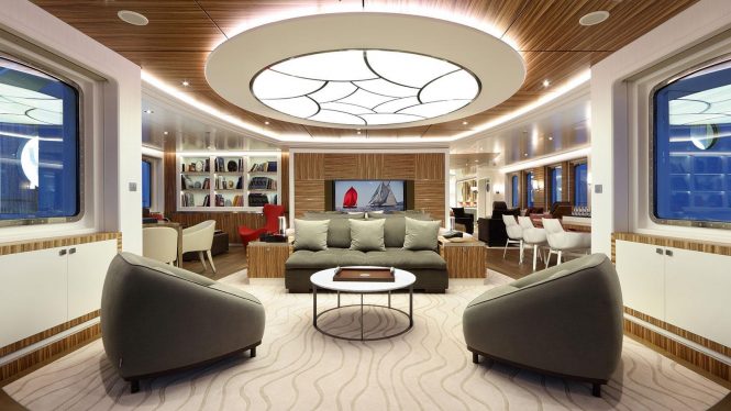 For dockside events at such destinations as Cannes or Monaco, there is plenty of room on board for entertaining inside and out: The sturdy modern exterior from Pierre Jacque Hubis offers a multi-purpose platform on the main deck aft that can be used for storing water toys, land-based vehicles and submersibles, and when clear can be used for a large outdoor celebration.