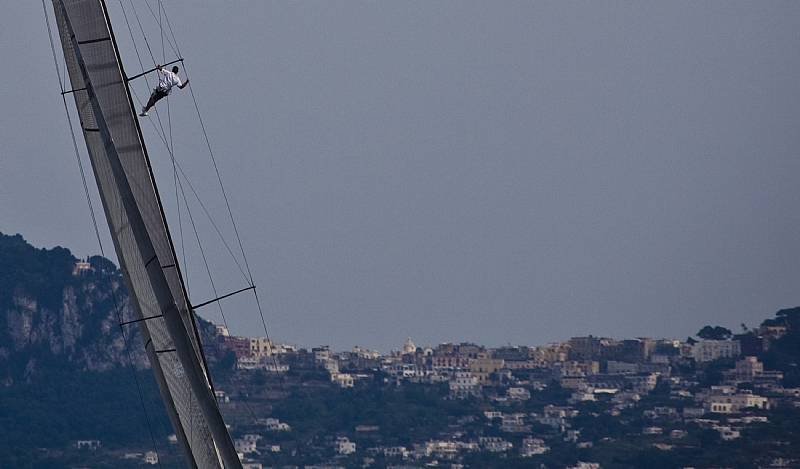Crew climbs mast of ALEGRE on their way back to the Marina Grande after the coastal race ALEGRE owner – Andy Soriano class – MINI MAXI ROLEX Carlo Borlenghi