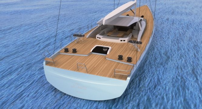Concept images show a fixed carbon fibre bimini in the cockpit for a sheltered all-weather outdoor living. Both the stern area and the bow have plenty of space for guests to use for relaxation and socialisation.