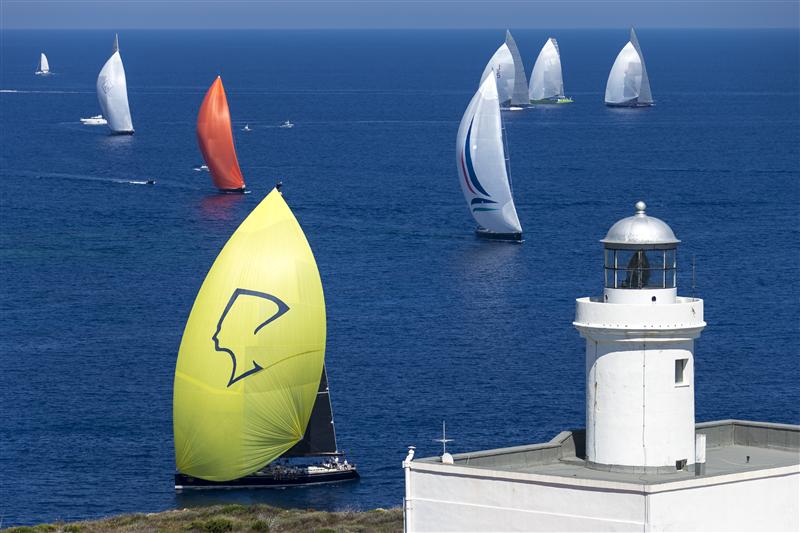 Super maxi and J classes sail pass Capo Ferro during the first day of racing