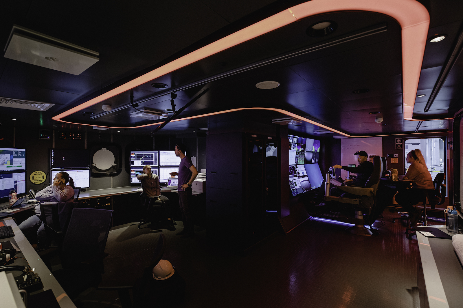 OceanX team is seen here in mission control where multiple teams collaborate and share information to make sense of their discoveries – Credit Taj Howe