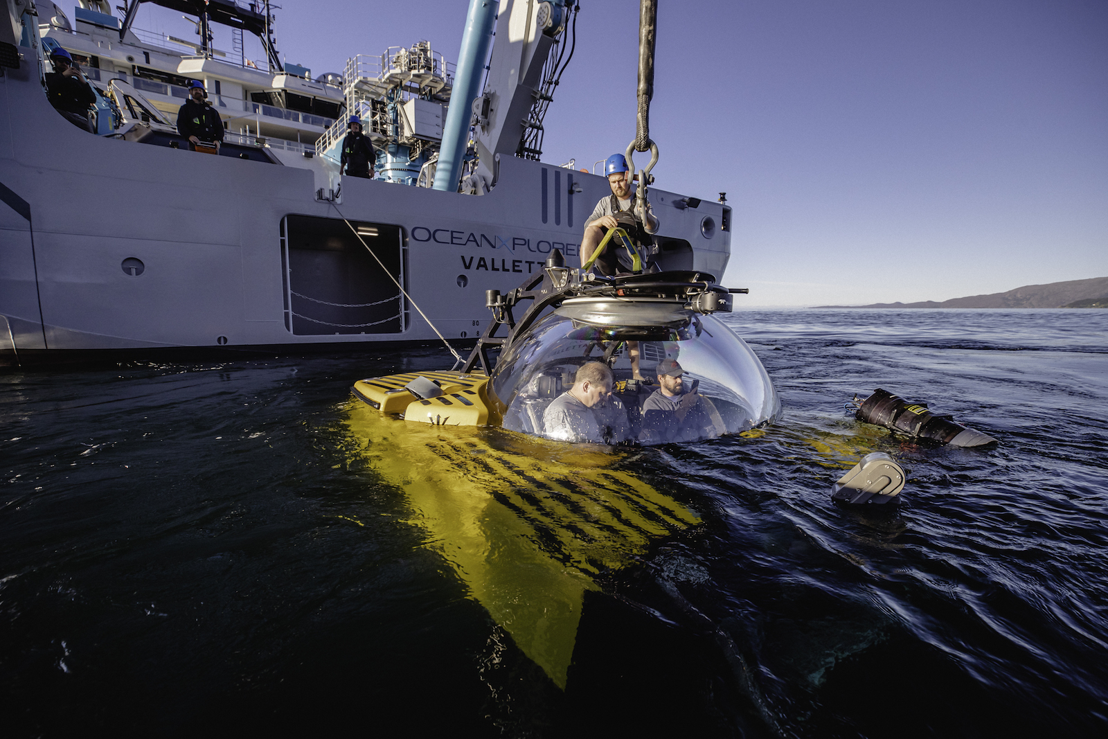 Triton submersible is lowered into the water as the ships crew and science team test its systems in preparation for future missions – Credit Taj Howe