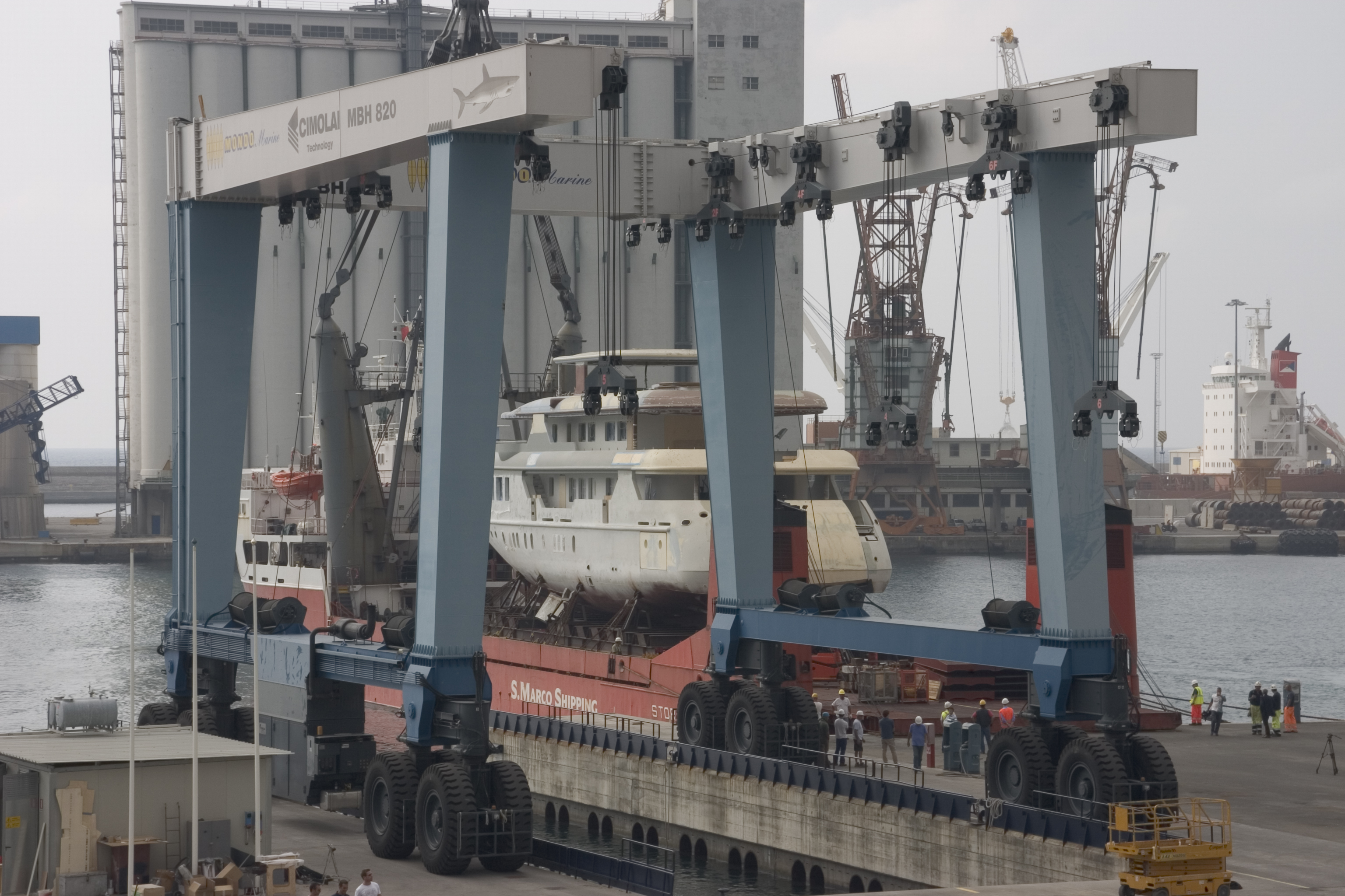 Mondo Marine to Refit motor yacht VIUDES 45 – Unloading the yacht onto land involved some spectacular operations. Work went on throughout the day.