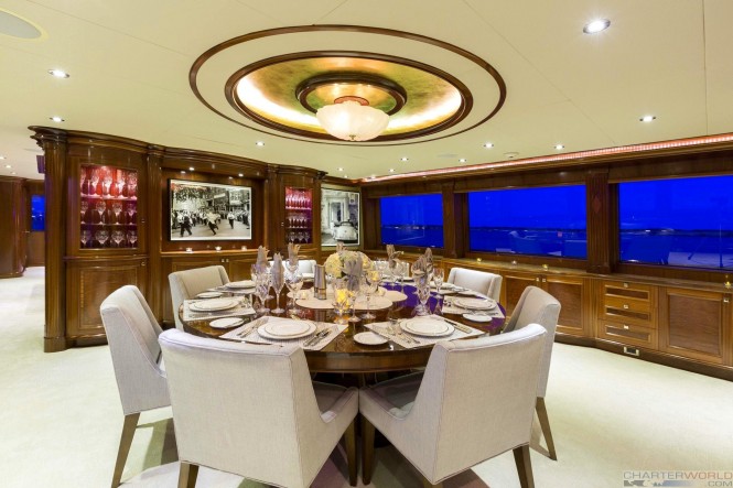 The formal dining area consists of a beautiful dark mahogany table that complements the silvery-white Murano glass chandelier overhead. A shimmering golden water-wall produces a relaxing ambiance and the finishing touch to any formal occasion. After dining, guests can watch a film together on the large flat-screen TV or entertain on the Grand Piano, however the large Jacuzzi on the fly-bridge is an excellent location to watch the sunset.