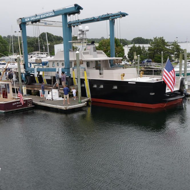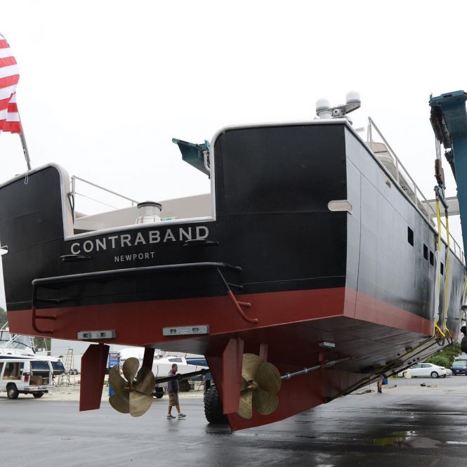 Construction began on M/Y CONTRABAND in July 2017 and represents the largest yacht so far from NEB. The naval architecture also comes from the shipyard and a plumb bow combined with classic styling gives her a timeless appearance with modern efficiency. She is designed for world cruising and has been described by New England Boatworks as ‘durable and rugged’, fitted with tugboat engines capable of 13 knots while cruising and designed to be operated by a small crew.
