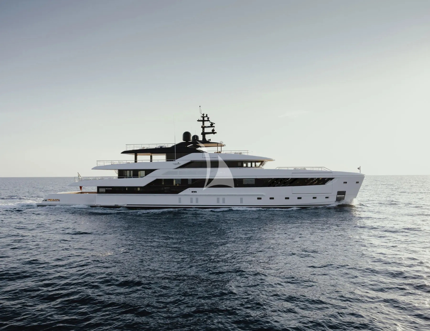 The vast exterior areas of Sanlorenzo SL86 yacht host a living area in the bow with sofas, table, chairs and adjustable sun shades. The main salon is full of natural light, thanks to large windows, allowing guests to enjoy a sea view while seated. There is also a lovely main lounge area with a stylish floating glass staircase leading to the flying-bridge.