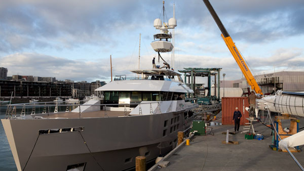 For the first part of her voyage Big Fish was assisted by two harbor tugs, who helped circumvent sandbars on the Tamaki River and negotiate a low bridge clearance. Once clear of Achilles Point Big Fish dropped her tow and headed down the Motukorea Channel under her own power for the first time. Full throttle was achieved at 1625 RPM, with a boat speed over the ground of 14knots. Extensive maneuvering trials were also conducted before an anchor drop test was made. Wing stations as well as bridge helm propulsion controls all operated flawlessly and at a few minutes after Noon, Big Fish was secured port-side-to at the Viaduct with captain, crew, project manager and team of shipyard workers and suppliers highly elated after successfully completing the yacht’s first crucial sea-trial.