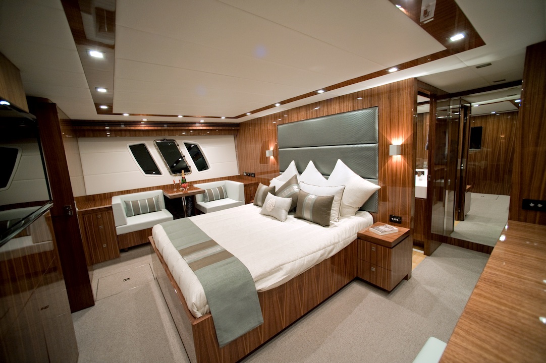 New Ocean Yachts 68 Enclosed Flybridge Motoryacht – Full beam master stateroom is an owners oasis