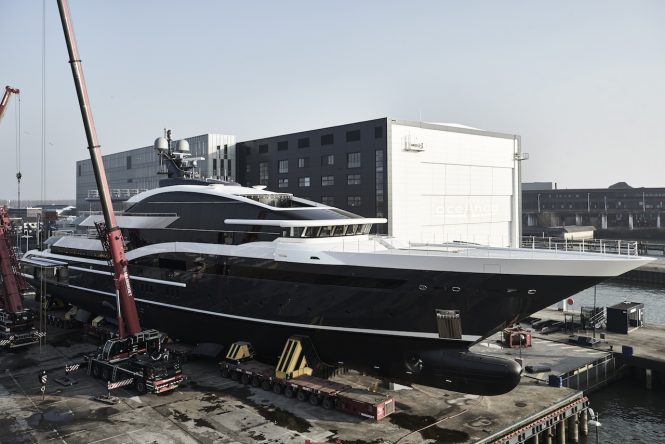Oceanco mega yacht Y717 Project Shark emerges from the shipyard for the first time, as the shipbuilder is celebrating her technical launch. The yacht will undergo final stages of competition and sea trials before her delivery in late spring 2018.
