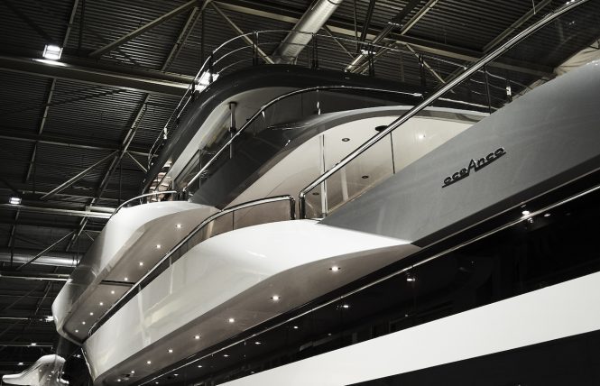 The glass pannels of a significant size allow natural light which brightly lits in the interior. With a bema of 14.2m Y717 Project Shark features voluminous spaces, designed and decorated by bespoke Nuvolari Lenard.