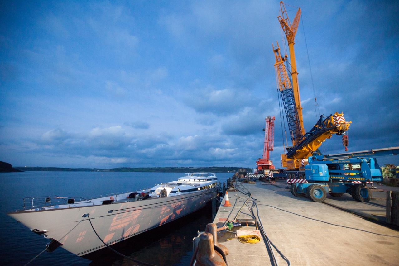 This image is featured as part of the article Sailing yacht M5’s 89m mast re-stepped at Pendennis by Marine Results.