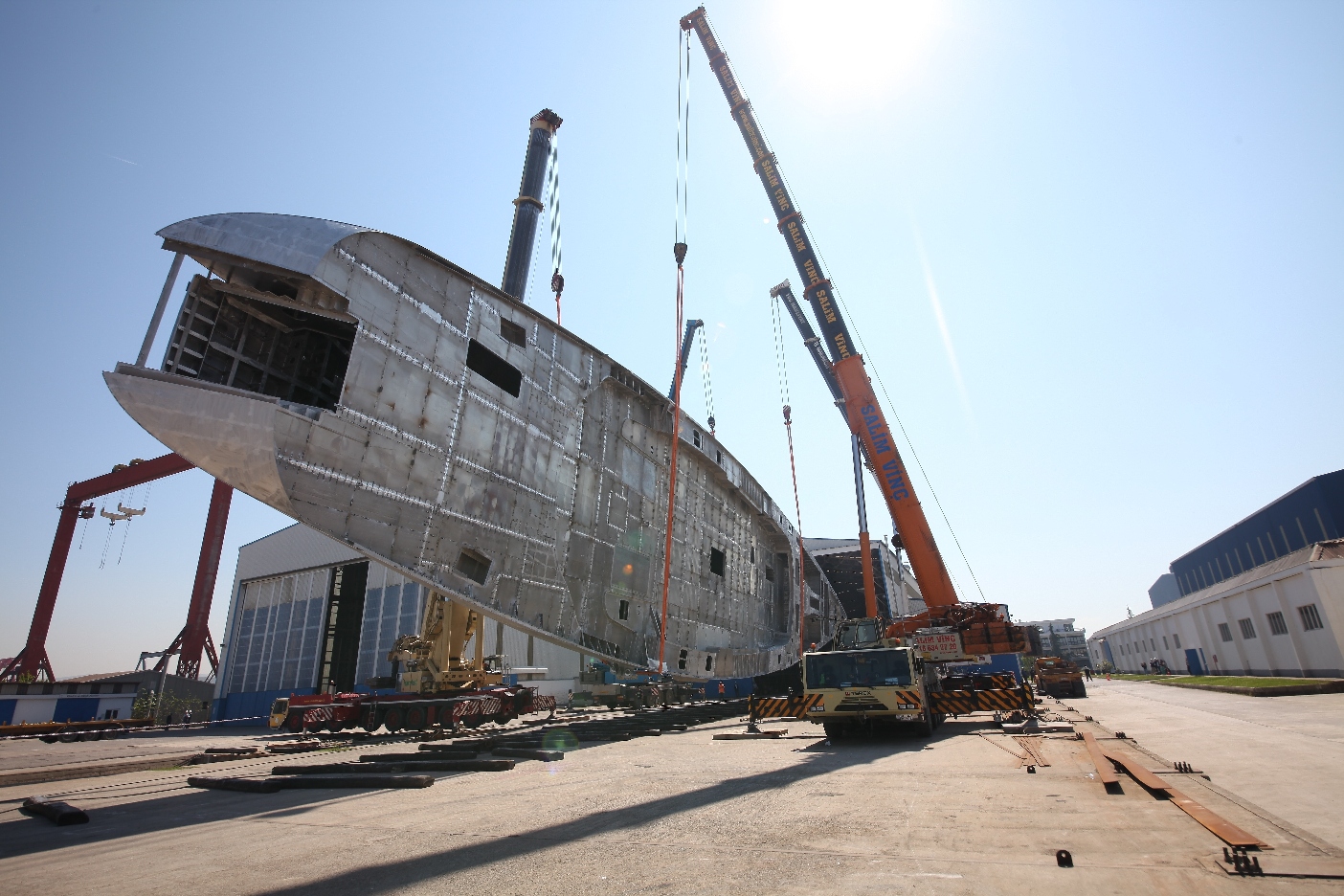 This image is featured as part of the article Perini Navi Hull C.2227 SYBARIS superyacht’s hull turned.