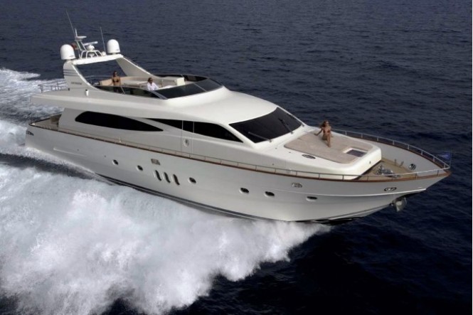 A Canados design, both for the exterior and for the interior, the Motor Yacht Canados 86 immediately strikes you for the elegance of her sweeping lines, alongside the volumes of the deck structure. Tradition best embodies the themes of Canados  long and renowned production with the greatly reliable and effective hull and the care of details. Accurate study of layout, both of the exterior and the interior, allowed to make the most of the exceptionally wide room on this 26-mt yacht Canados 86. The greatest pride of this project is the new tender-free flybridge, whose layout is simply perfect to enjoy holidays in the open air, both when cruising or resting lazily in a quiet bay. But it is especially inside that one becomes aware of the extraordinary size of the space aboard. The open-space living, the dining area, the large galley and a courtesy head are positioned on the main deck, while the four cabins – the full width owner’s suite, two double cabins with ensuite–bathroom and, further forward, the VIP cabin – are located on the lower deck. The two crew’s cabins are located forward of the VIP cabin. Technical details: overall length: 26,48 mt.; max. beam: 6,40 mt.; draft: 2,00 mt.; displacement: 63 tons; fuel capacity: 9.000 lt.; water capacity: 1.800 lt.; cruise speed: 29 knots; max. speed: 33 knots; engine: CAT C32  2 x 1800 hp;