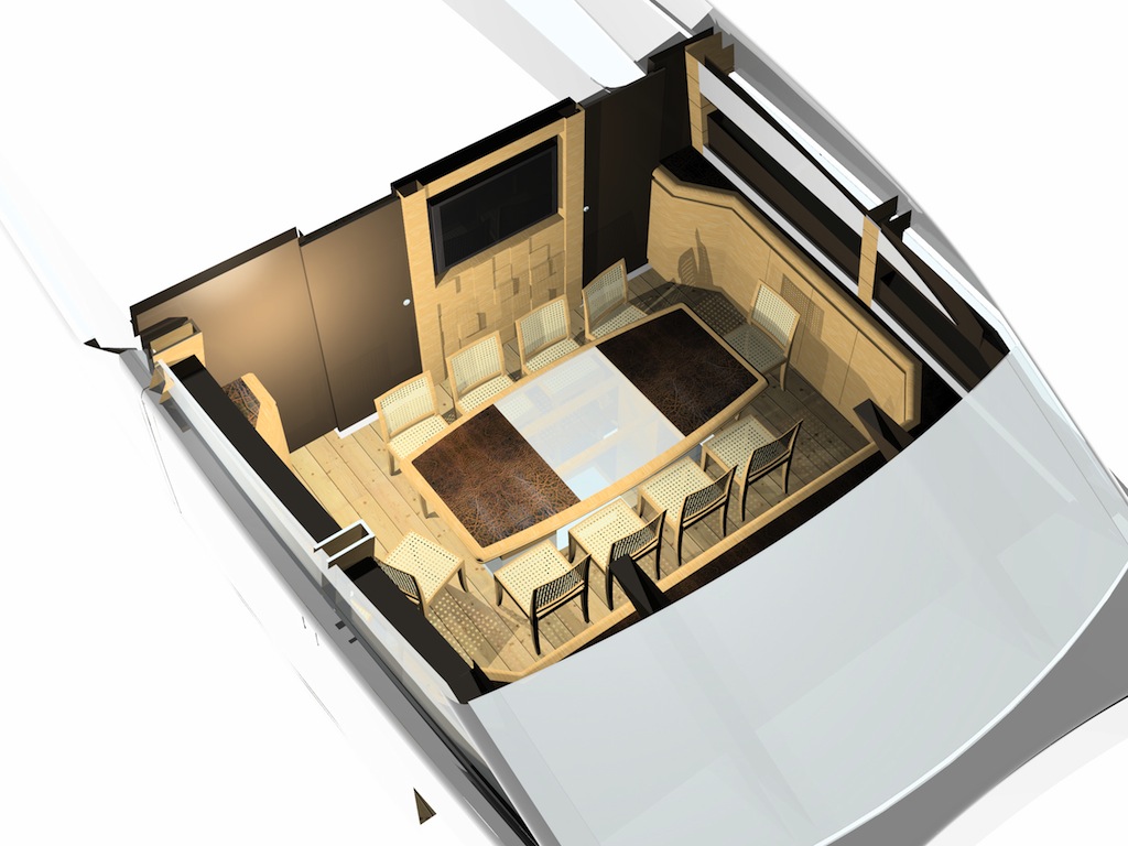 Please contact CharterWorld - the luxury yacht charter specialist - for more on superyacht news item "Pro Ship 28m FLY motor yacht dining area from above".
