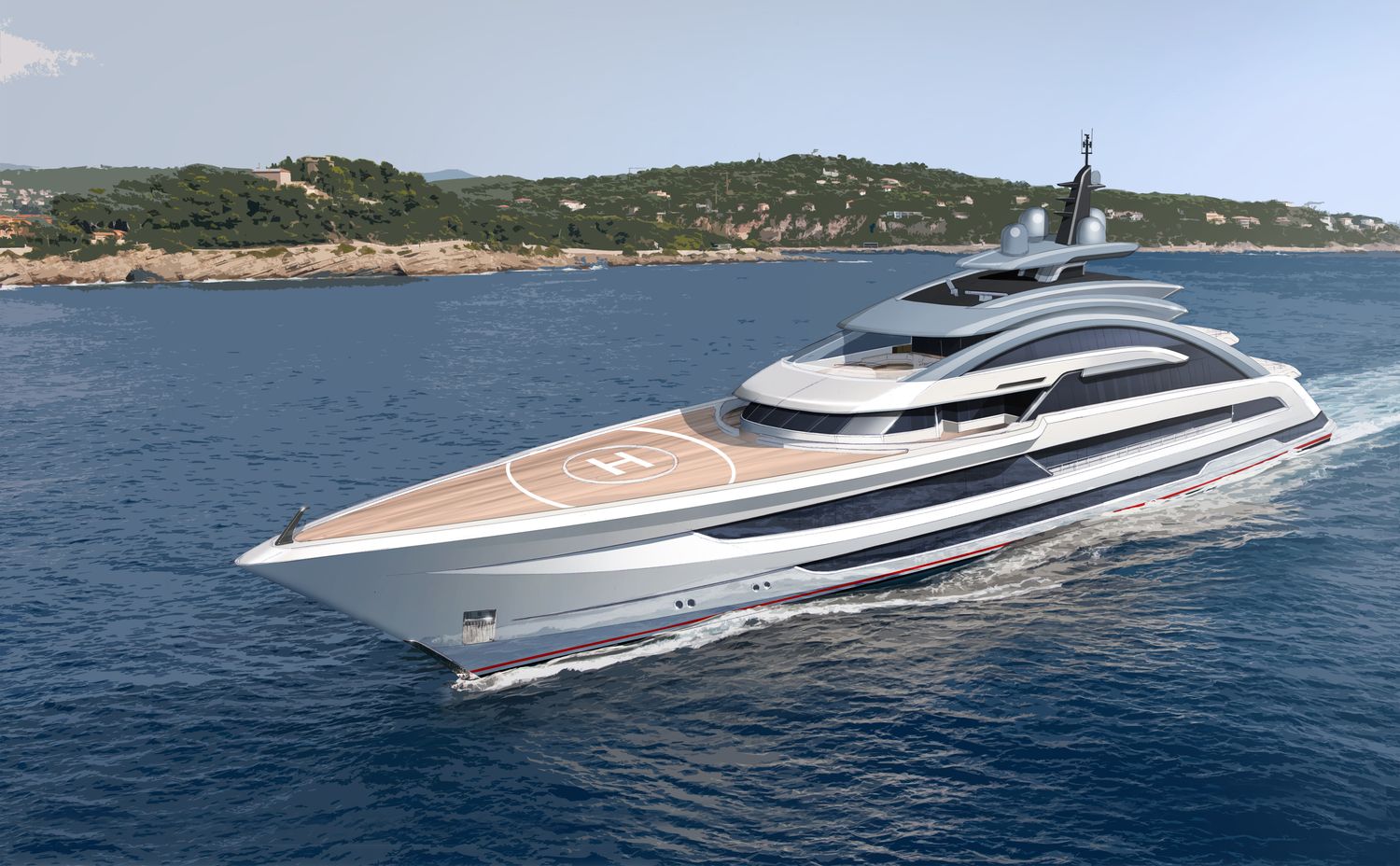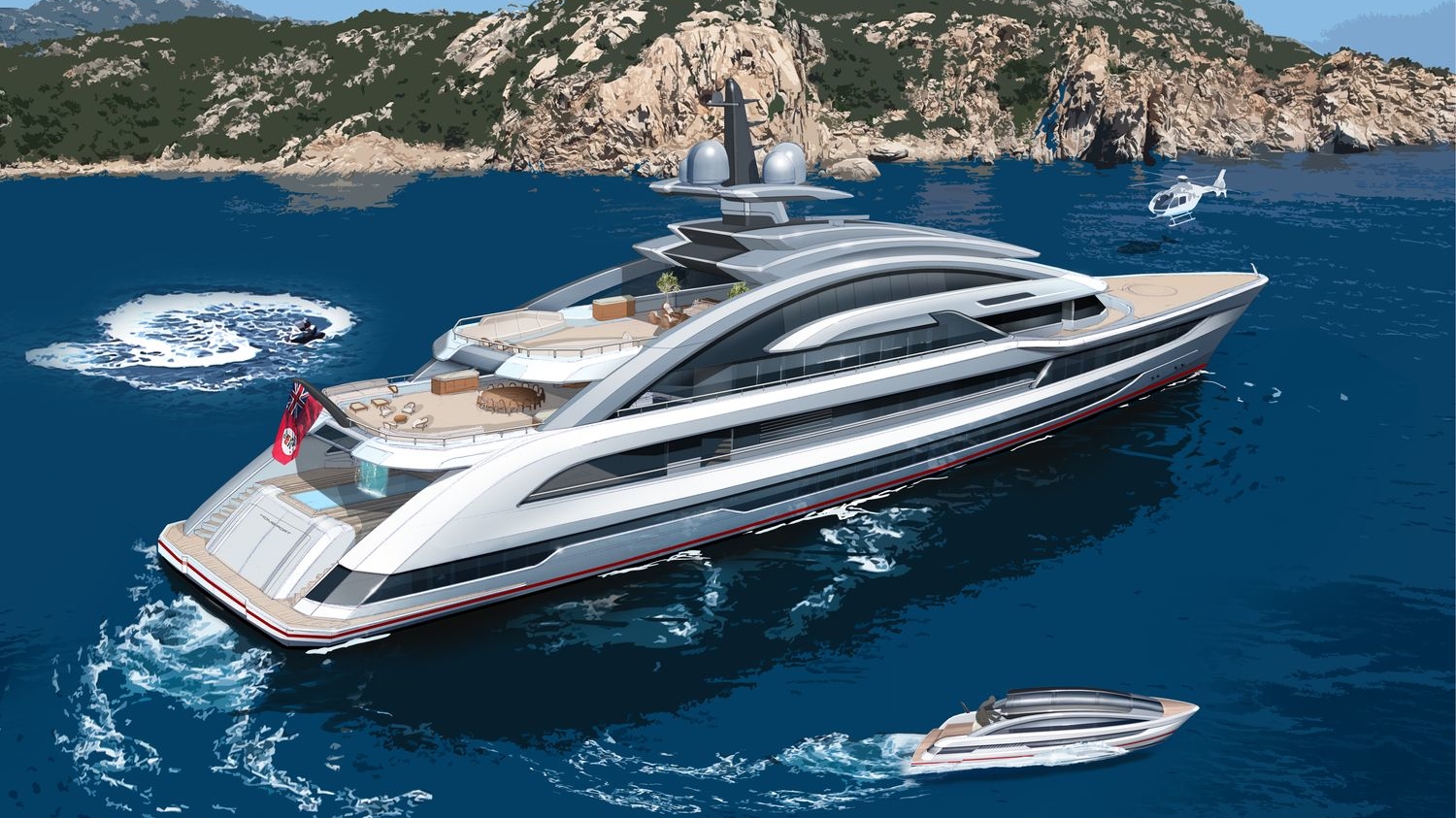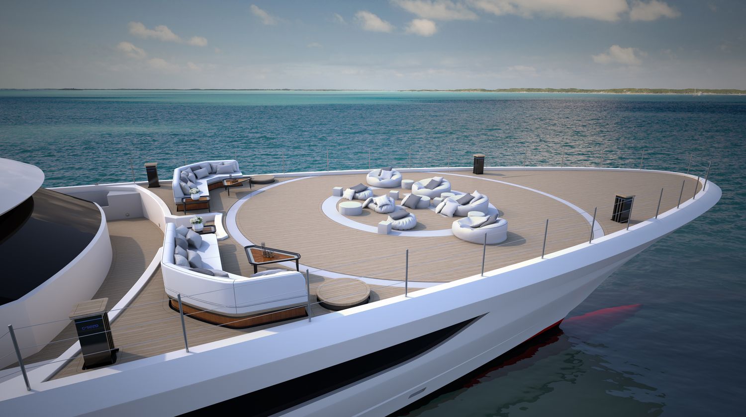 The beach club is a particularly desirable environment as it is illuminated from above by sunlight through the glass-bottomed swimming pool and has two sea terraces. The tender garage has been moved under the foredeck helipad, where a custom-designed limousine tender is launched through side hatches.