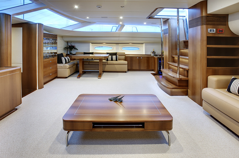 LIARA’S main saloon is peaceful when relaxing with a book from the library, styling when entertaining and ideal for enjoying a movie while lounging on the plush sofas.