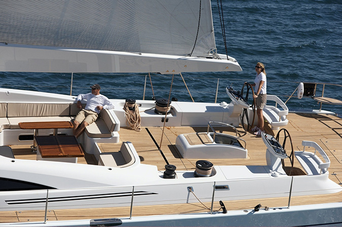 Sailing yacht LIARA‘s decks are streamlined and uncluttered. Her helming area is aft and her spacious cockpit is forward, as completed with a sunbathing space and hammock on the foredeck.