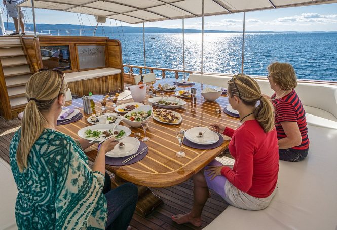 This two-masted wooden sailing yacht boasts an abundance of deck space for guest use: The coach roof has been turned into a sunbathing area where the group can take in the surroundings from an elevated point on board. Behind, the hardtop shading the main deck aft is covered in solar panels to reduce reliance on fossil fuels for running hotel loads (hot water, TVs etc.) on board.