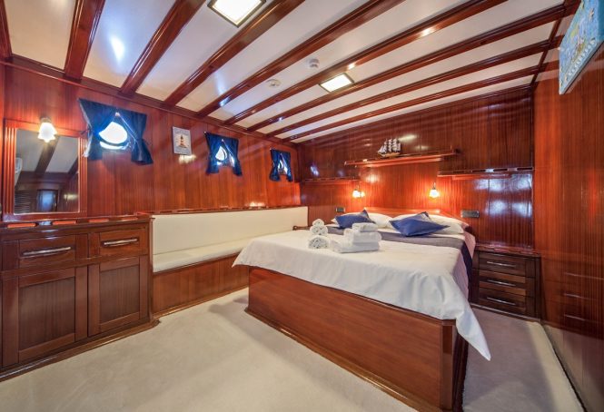 Just as the rest of luxury yacht STELLA MARIS is traditionally styled, so is the accommodation. However, all 16 guests accommodated across 8 en-suite cabins will be provided with the height of luxury, whether staying in the Master suite or VIP stateroom, one of the double cabins or the two twin cabins. Each cabin is fully air-conditioned and the en-suite bathrooms provide a sink, toilet and shower.