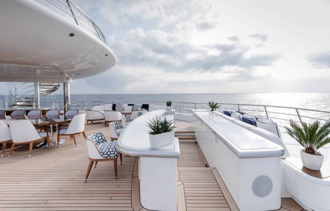 More than just good looks went into the making of this motor yacht, and guests on board can treat themselves daily to the main deck aft counter-current swimming pool with a glass-bottom panel, a private Jacuzzi on the Owner’s deck, and the bridge deck aft sports a 14-person alfresco dining table, a sumptuous lounge along the stern and a bar.